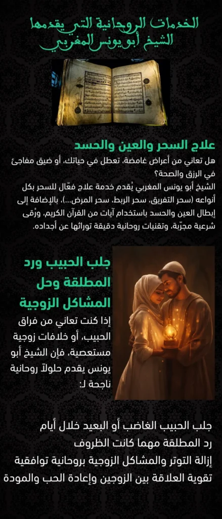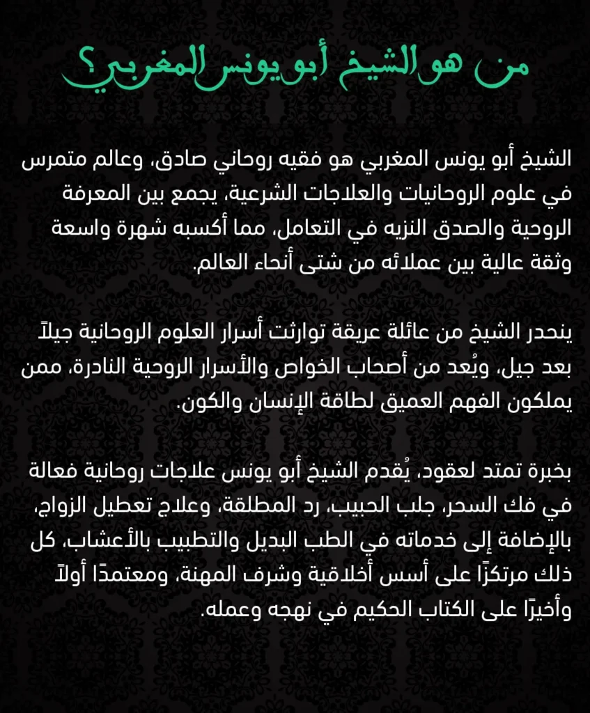 هل تبحث عن خدمات روحانية صحيحة ومجربة؟ أبو يونس المغربي يقدم لك الحلول الروحانية الموثوقة بكل سرية واحتراف 📞 تواصل معنا الآن لتحصل على المساعدة التي تحتاجها